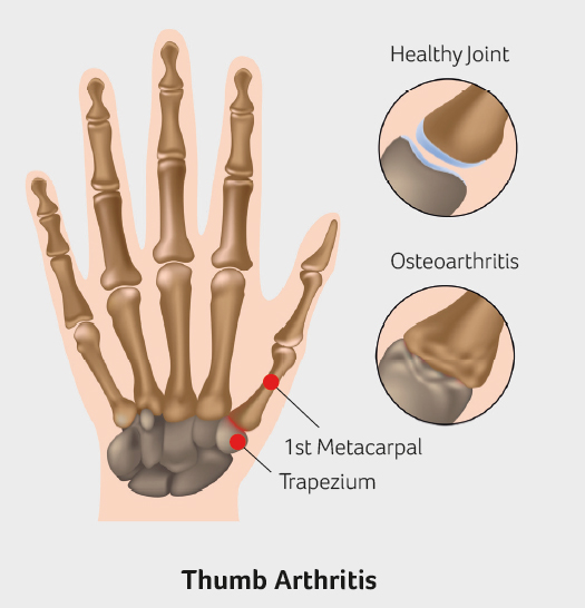 Pain at the base of the thumb occurs with excess loads such as unscrewing the tops off jars, and pinch grip. Arthritis is very common particularly in women over 50 years. In men, thumb base arthritis is usually due to a previous fracture. Bony swelling may be present and pressure at the thumb base is often painful. X-rays show bone-to-bone contact with osteophyte (extra bone) formation. Treatment is tailored to each individual patient and needs detailed discussion with your surgeon. Options include steroid injections and splinting, removal of damaged bone using tendon as a spacer, and different types of joint implants.