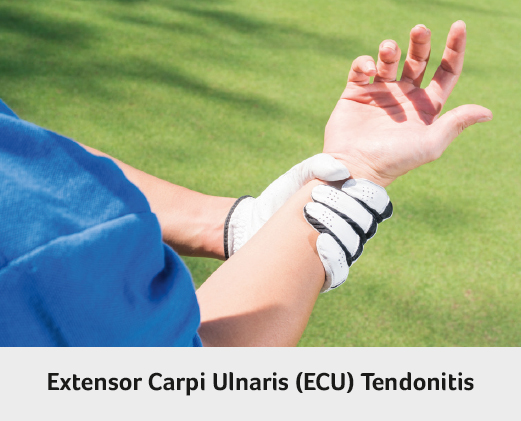 ECU tendinitis is inflammation of the wrist tendon on the little finger side of the wrist. Patients complain of wrist pain and loss of grip strength. Pain is worsened by rotation of the wrist and the “dart throwing” wrist motion”. Golfers and any racquet ball players are at risk injury and inflammation of this tendon. Ongoing pain may be due to rupture of the tendon sheath that holds the ECU tendon in place. If the sheath is torn, the tendon can roll in and out of the tendon groove, known as subluxation. The patient complains of a painful snap as the tendon rolls out with the palm down motion in the downswing during golf, for example. Tendonitis symptoms usually settle with conservative treatment such as rest, splinting and injections. Rarely surgery may be required to repair the ECU and surrounding tissues.
