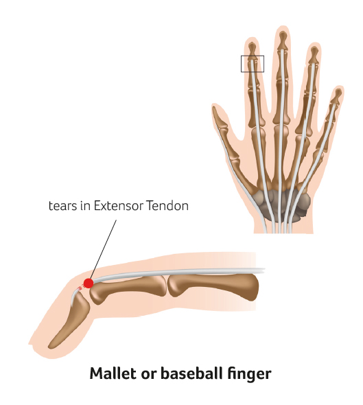 A mallet or “baseball” finger occurs when the finger is forcibly stubbed and the end finger joint (distal interphalangeal joint) is suddenly bent forwards. The extensor tendon on the back of the finger is pulled off the bone, sometimes pulling a fragment of bone with it. The patient cannot straighten the end of the finger and the joint is held in a bent position. Most cases can be treated with splinting for up to 8 weeks. However older injuries may require surgical repair of the tendon back onto the bone and temporary wiring of the finger to allow healing.